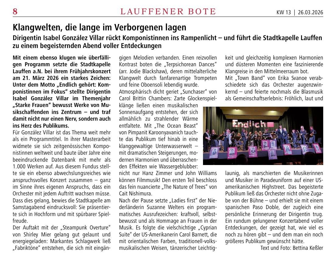 Starke Frauen stehen beim diesjährigen Konzert der Stadtkapelle Lauffen unter Leitung von Isabel González Villar im Vordergrund.